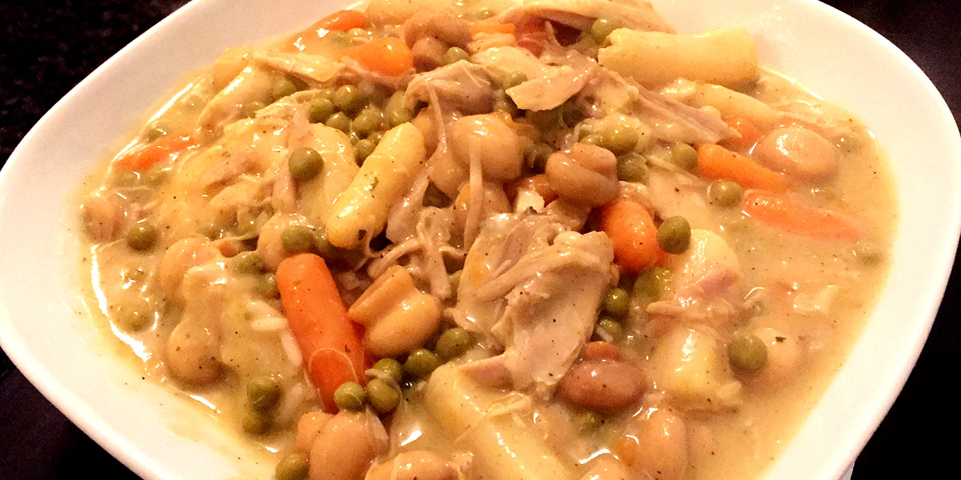 3. Margarine in den Topf geben und erhitzen, das Mehl wird nun unter schnellem Rühren hinzugefügt. Nun die Geflügelbrühe in die Mehlschwitze geben. Erst ein bisschen – um die Brühe mit der Schwitze zu verbinden und um Klümpchen zu vermeiden – dann die restliche Brühe hineingießen. Die Brühe wird darauf etwas dickflüssig. Ca. 10 Minuten unter häufigem Rühren köcheln lassen und mit Salz, Pfeffer und Currypulver abschmecken.